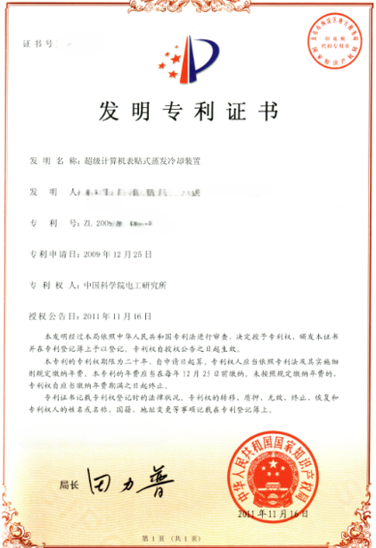 发明专利证书 —— 超级计算机表贴式蒸发冷却装置
