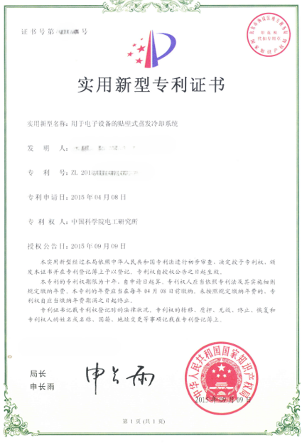 实用新型专利证书 —— 用于电子设备的贴壁式蒸发冷却系统
