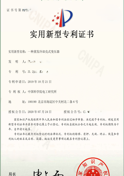 实用新型专利证书 —— 一种蒸发冷却壳式变压器